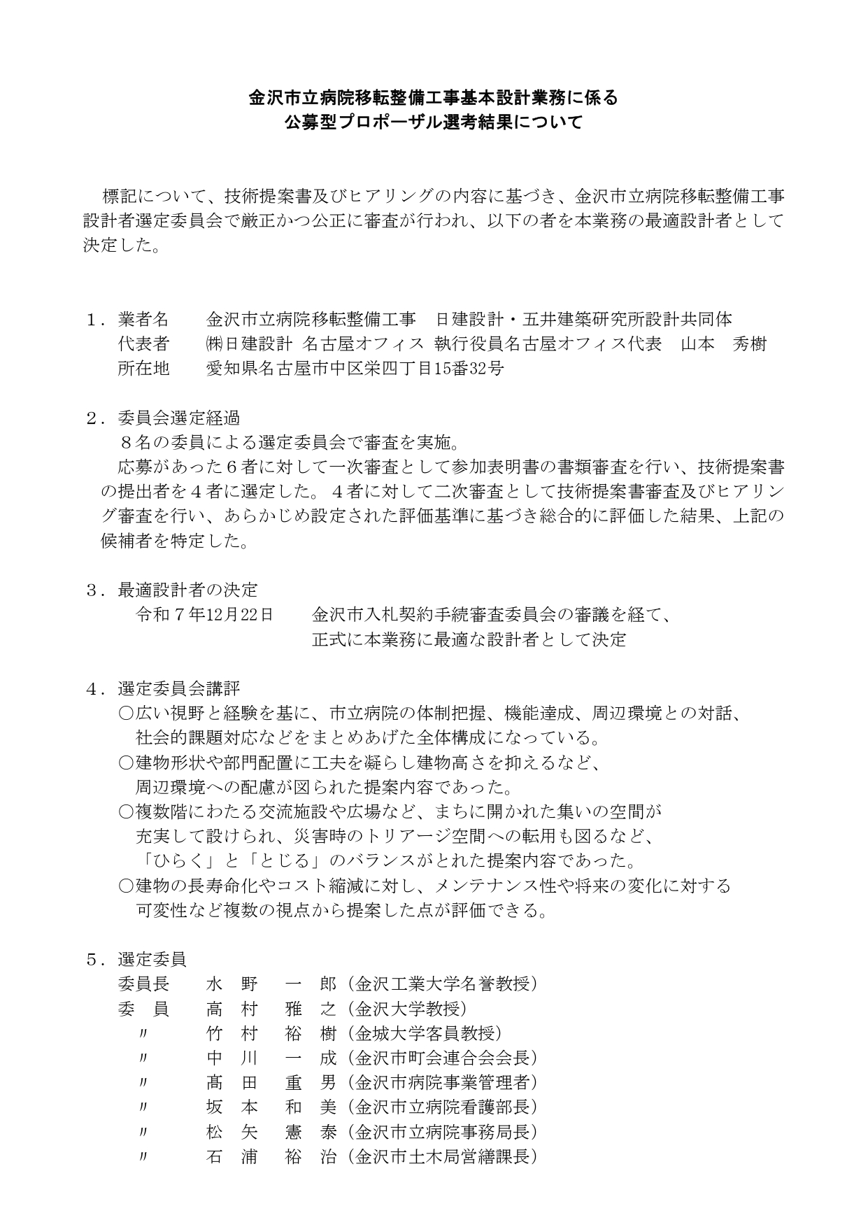 金沢市立病院移転整備工事基本設計業務(公募型プロポーザル)
