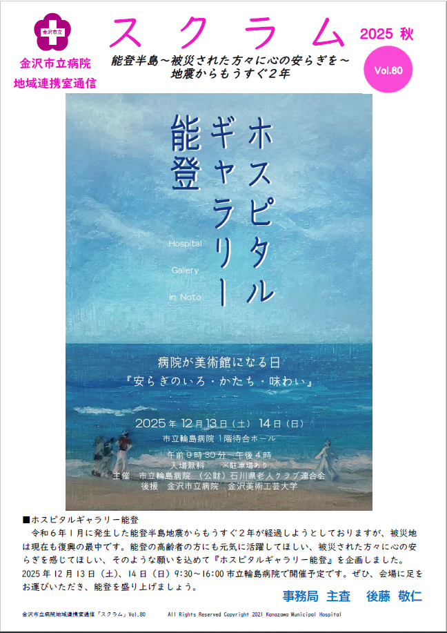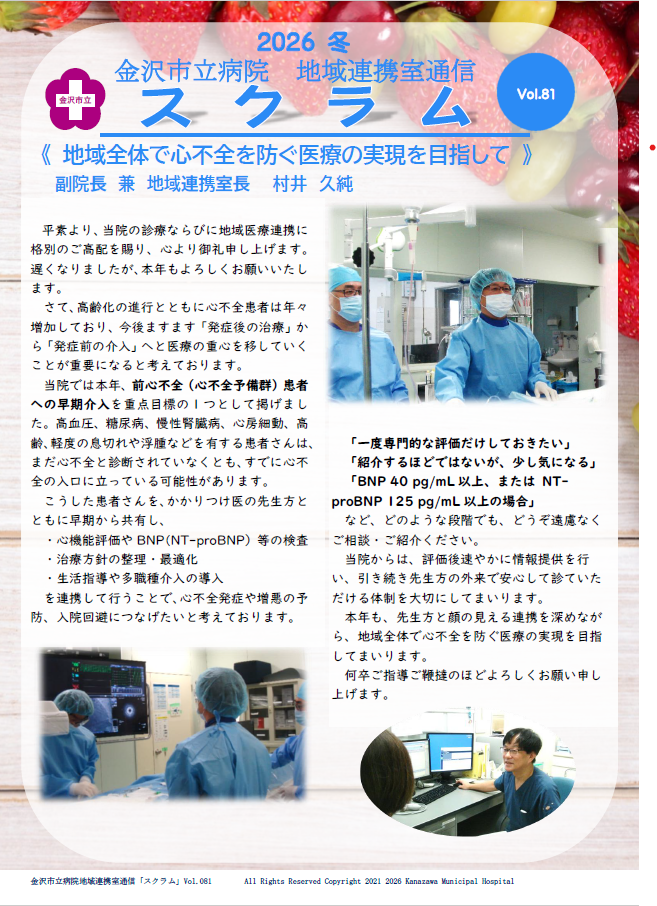 また、平成20年12月より愛称を「スクラム」と定めまして、さらなる内容の充実をはかっています。「スクラム・地域連携室通信」で、金沢市立病院の最新の話題をご覧ください。